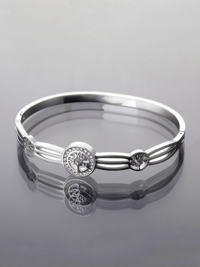 Jednoduchý a elegantní náramek z leštěné chirurgické oceli ve stříbrném provedení. Ozdoben motivem stromu života, který symbolizuje sílu, rovnováhu a propojení.