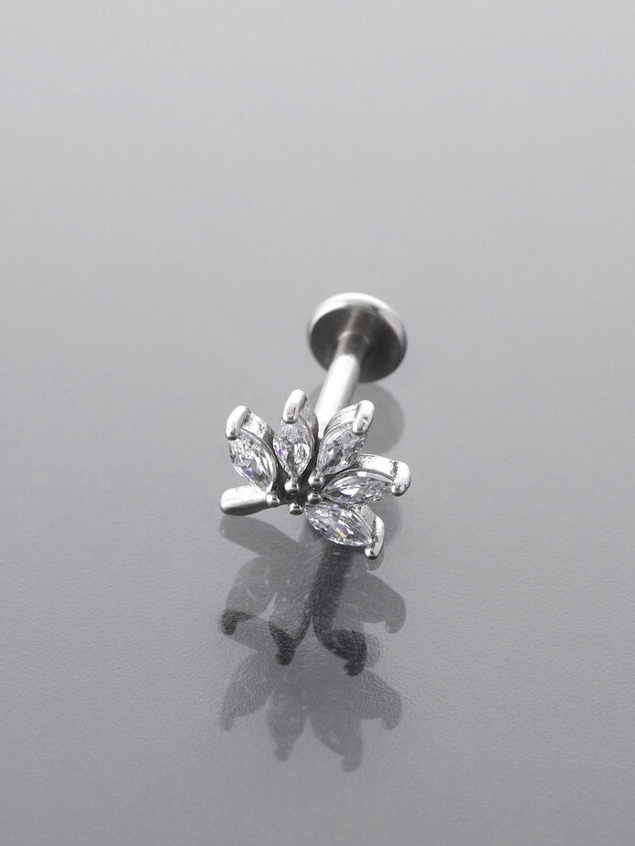 Tento elegantní piercing ve tvaru jemné tyčinky z kvalitní chirurgické oceli zaujme na první pohled – zdobí ho složený lístek s čirými krystalky, které krásně odráží světlo. Díky univerzální délce cca 1 cm a tloušťce 1 mm se hodí nejen do brady, ale také do rtu nebo ucha.