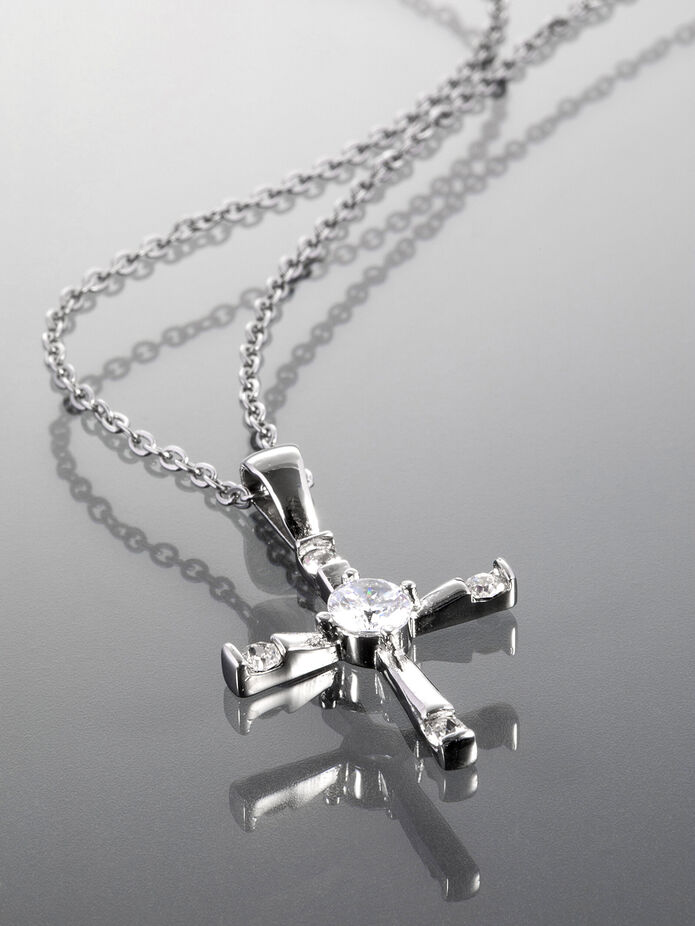 Nápadný náhrdelník z chirurgické oceli s přívěškem ve tvaru křížku zdobeného třpytivým krystalem uprostřed kříže je skvělým doplňkem k jakémukoliv outfitu. Délka náhrdelníku je nastavitelná cca od 43 do 45 cm, rozměry křížku jsou 2,2 x 1,7 cm. Zapínání je na karabinku, tento typ zapínání skvěle drží a tak náhrdelník samovolně nespadne. Náhrdelník je tvořen jemným řetízkem stříbrné barvy, na kterém je navlečen křížek. Zpracování působí opravdu vkusně a nadčasově.