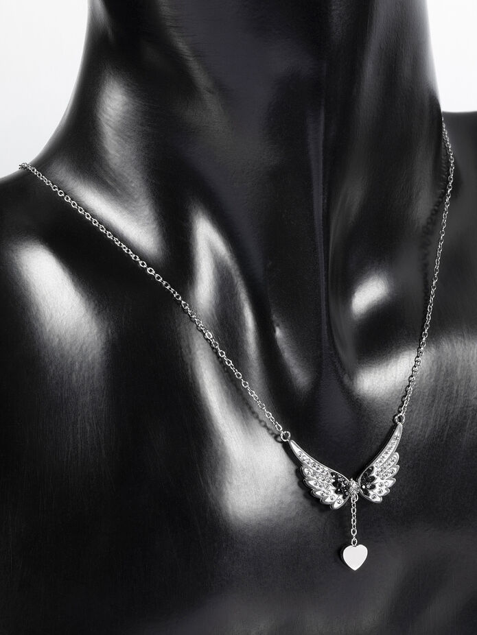 Překrásný náhrdelník z leštěné chirurgické oceli s přívěskem ve tvaru andělských křídel, které je zdobené krystalky, je skvělým doplňkem k jakémukoliv outfitu. Andělská křídla vás ochrání na cestě životem a přinesou vám klid, lásku a štěstí. Udělejte si i vy radost tímto zajímavým doplňkem!