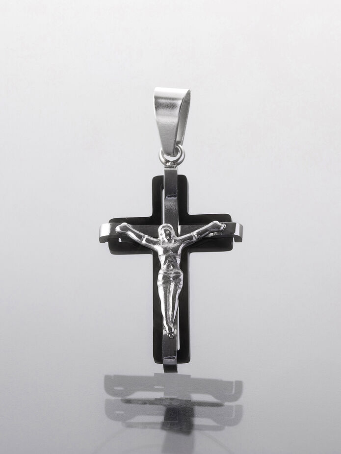 Výrazný přívěsek z chirurgické oceli s detailně zpracovaným motivem ukřižovaného Ježíše.