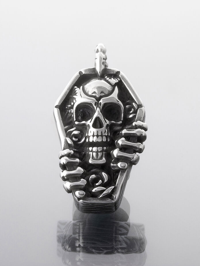 Výrazný masivní přívěsek ve tvaru lebky z leštěné chirurgické oceli.