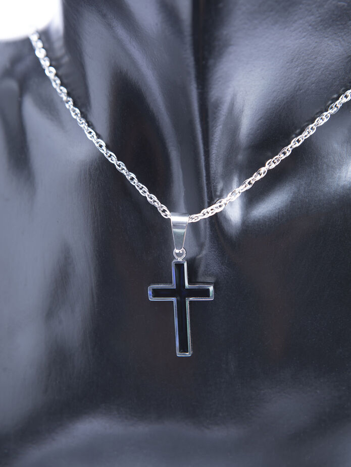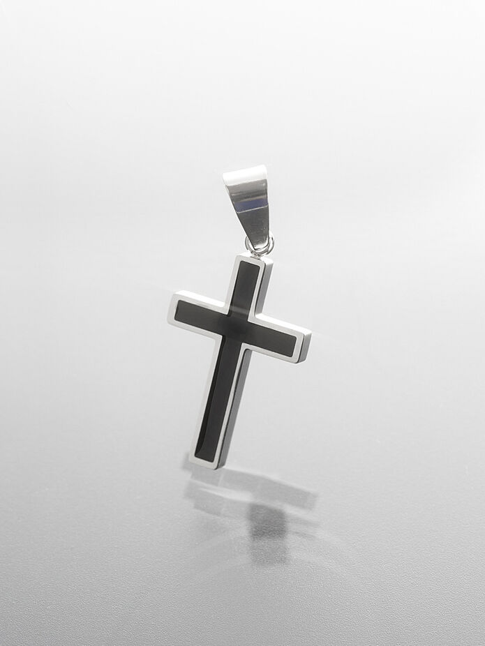 Jedinečný elegantní přívěsek z chirurgické oceli ve tvaru kříže v černo stříbrném provedení.