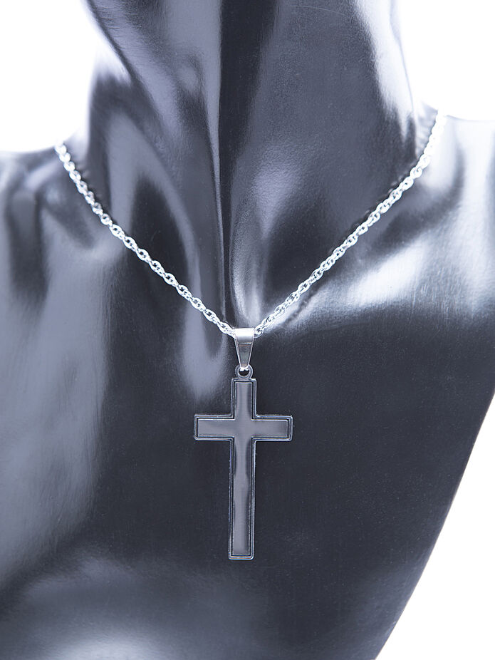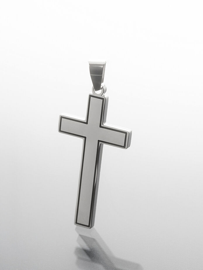 Jedinečný masivní přívěsek z chirurgické oceli ve tvaru velkého hladkého leštěného kříže s černou linkou.