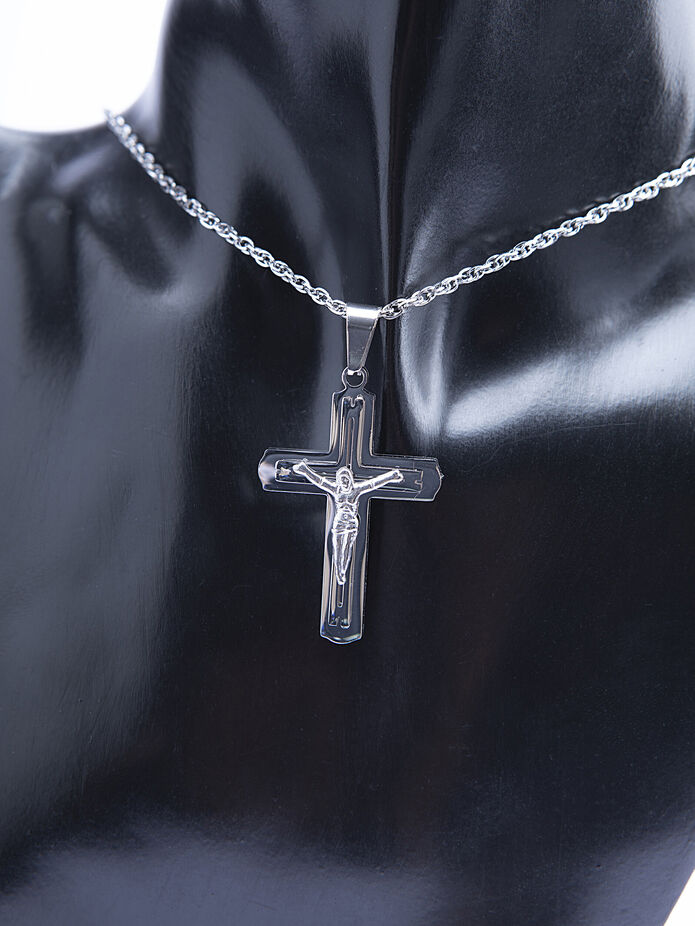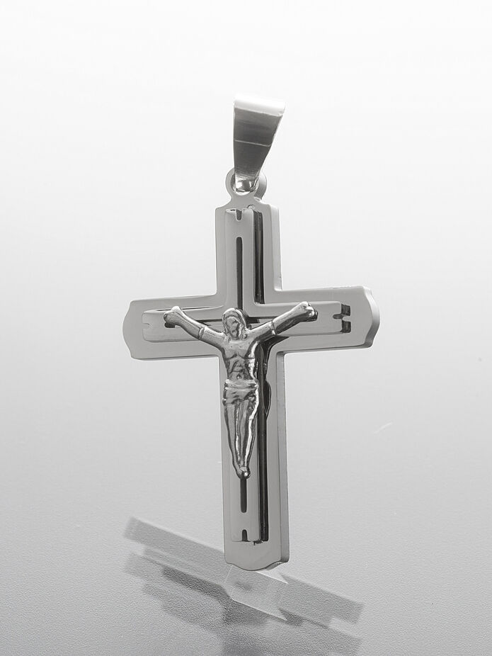 Nápadný lesklý přívěsek z chirurgické oceli ve tvaru kříže s Kristem.