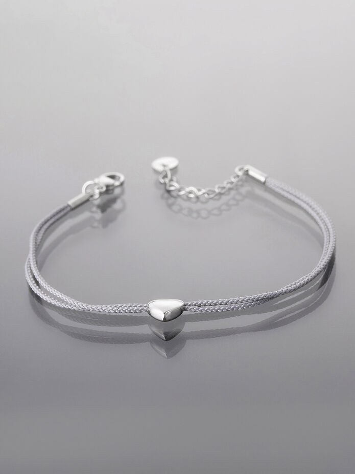 Jemný provázkový náramek s detaily z leštěné chirurgické oceli, zdobený drobným srdíčkem, je moderním doplňkem vhodným ke každému outfitu i ke každé příležitosti.