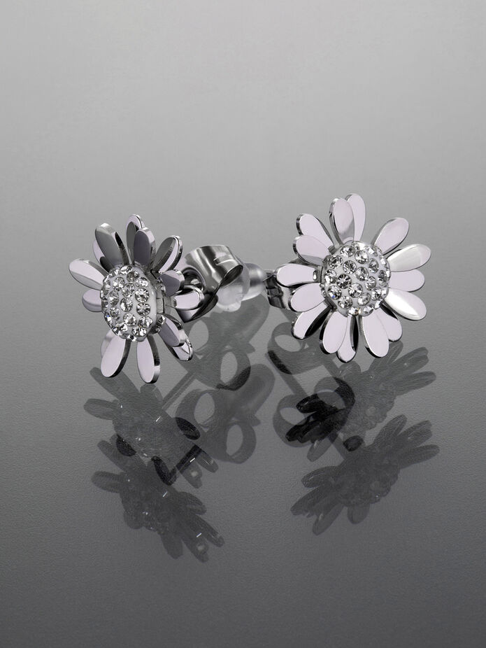 Slušivé náušnice z chirurgické oceli ve tvaru romantických květinek zdobených čirými krystaly.