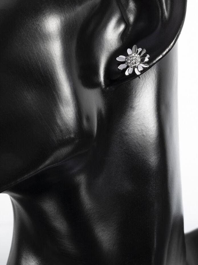 Romantické náušnice kytička vyrobené ze stříbrné chirurgické oceli. Vypracovány do tvaru kopretiny, střed zdoben třpytivými čirými krystaly. Elegantní módní doplněk pro všechny romantické ženy a dívky.
