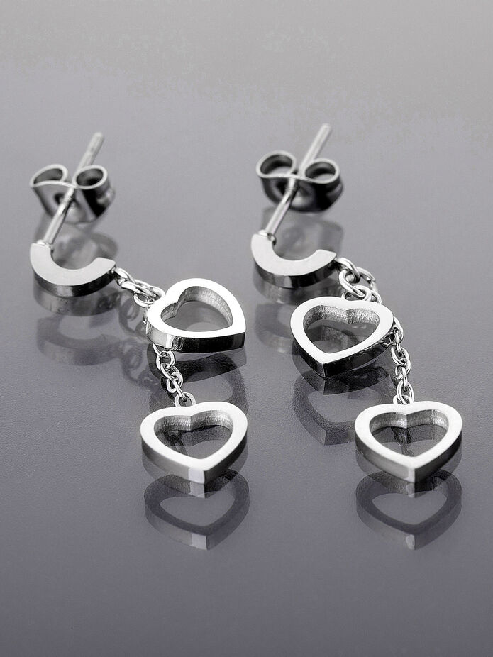 Jemné náušnice ve tvaru na řetízcíh zavěšených srdíček. Vyrobeno z leštěné chirurgické oceli. Doplňte svoji sbírku šperků tímto krásným, nadčasovým kouskem!