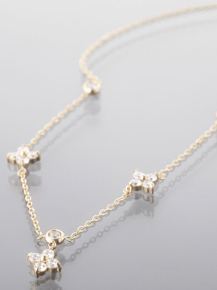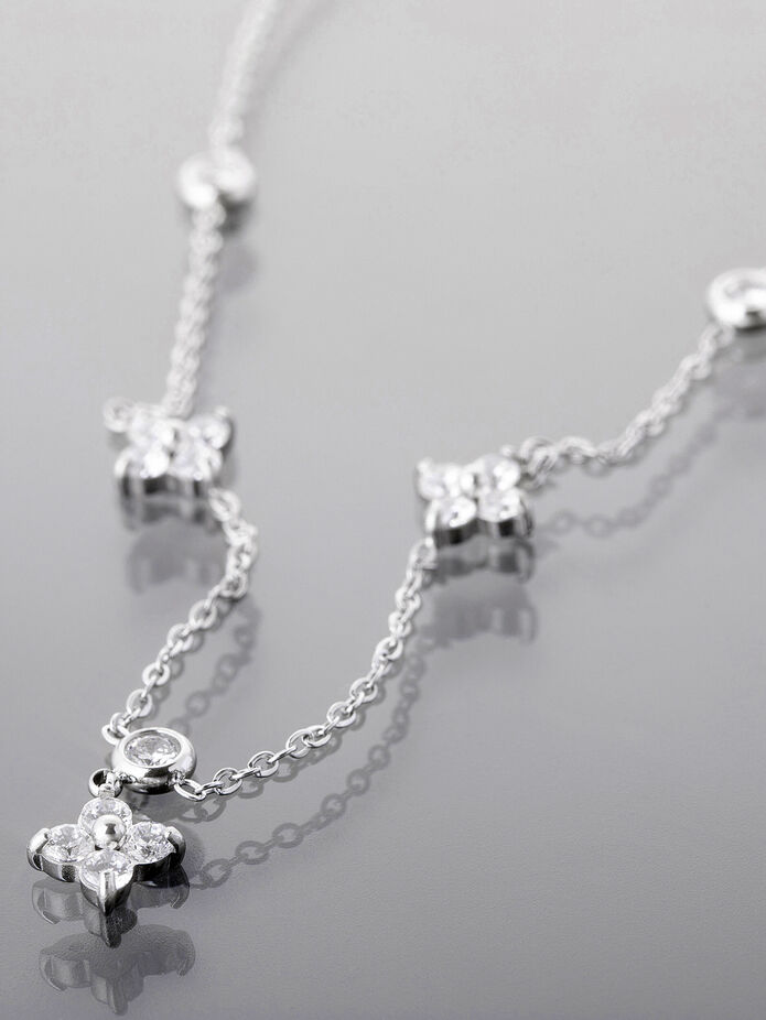 Jemný řetízek doplňují napevno umístěné drobné přívěsky, osazeno čirými třpytivými krystalky.