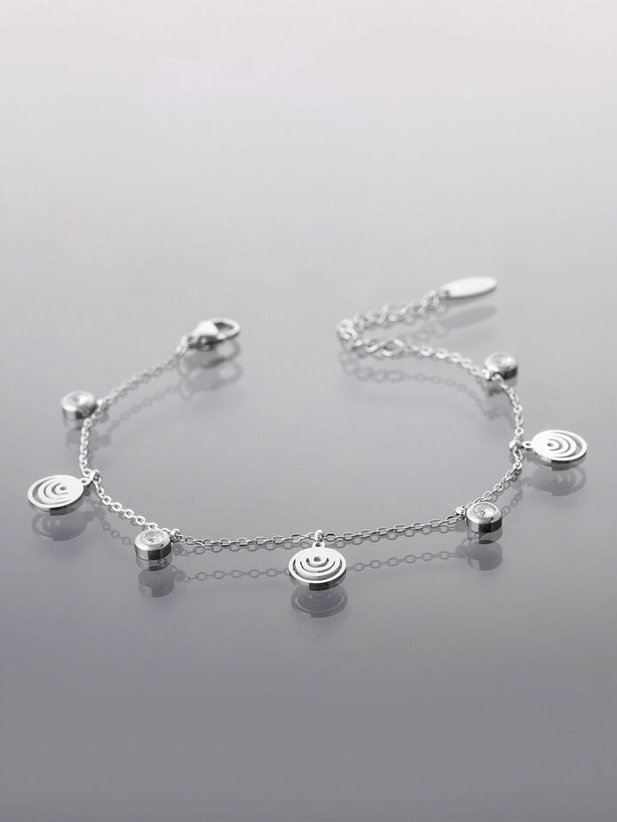 Jemný řetízkový náramek z chirurgické oceli ozdobený kolečky a krystalky.