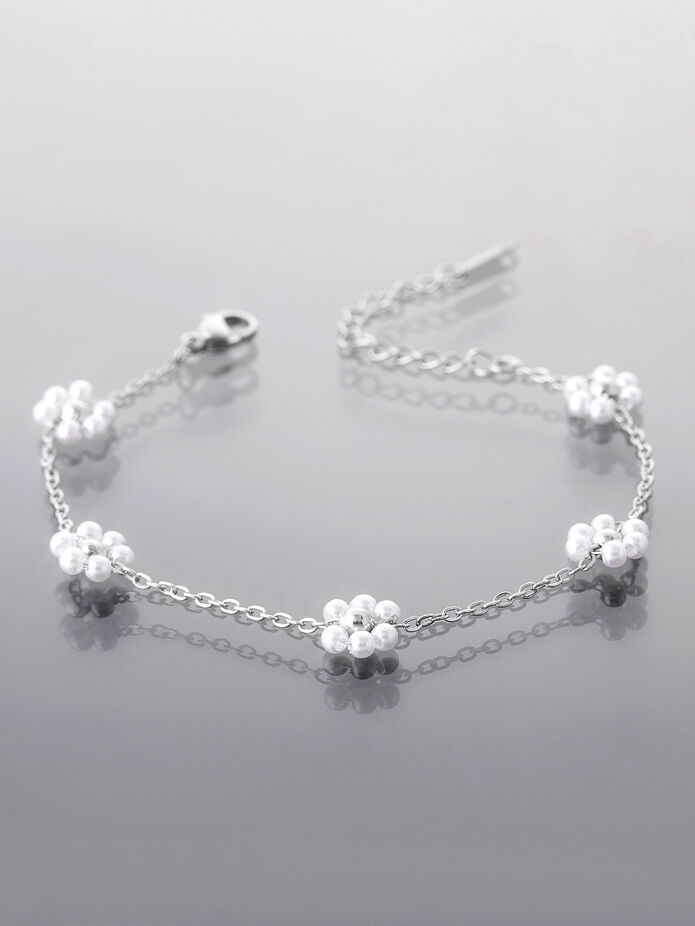 Jemný řetízkový náramek z chirurgické oceli ozdobený drobnými perličkami.