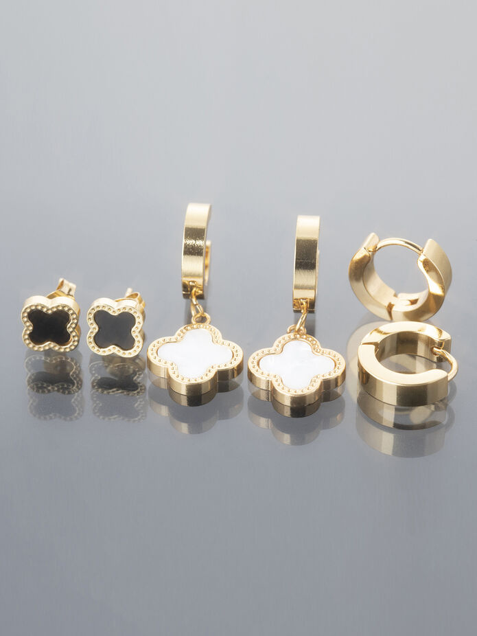Velikosti kroužků náušnic je Ø 1,4 cm. Dva páry kroužků, jeden pár pecky. Zdobeno vykládaným květem. Zlatá barva kovu.