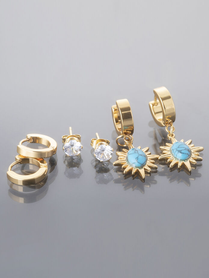 Velikosti kroužků náušnic je Ø 1,4 cm. Dva páry kroužků, jeden pár pecky. Zdobeno čirým kamínkem i tyrkenitem. Zlatá barva kovu.