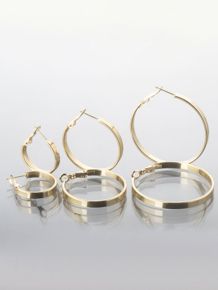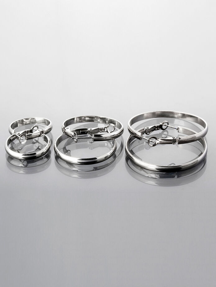 Velikosti náušnic jsou Ø 4 cm, 3,3 cm. 2,2 cm. Provedeno ve zlaté a stříbrné barvě kovu a vysokém lesku.