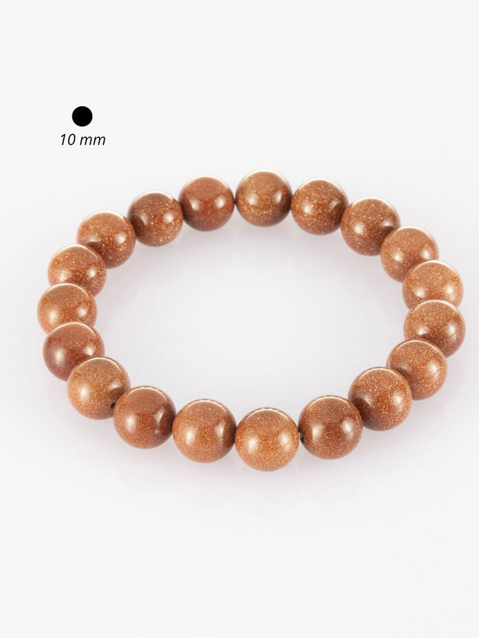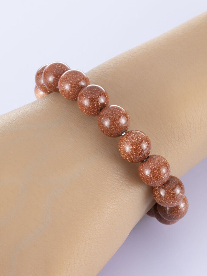 Náramek ze syntetického slunečního kamene. Je navlečen na pružné gumičce. Jeho obvod je 18 cm a šířka 1 cm.