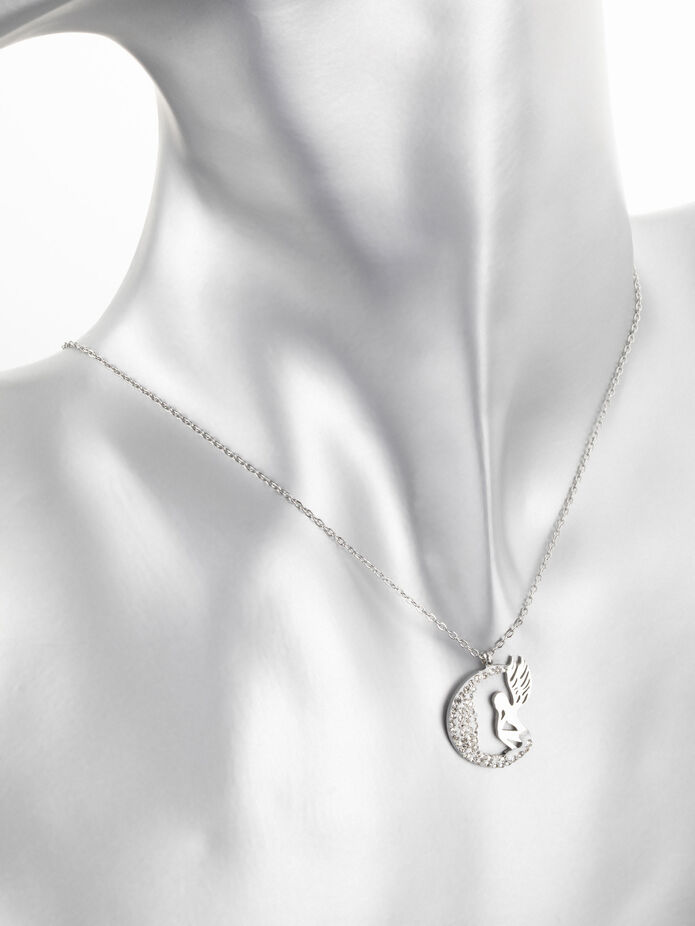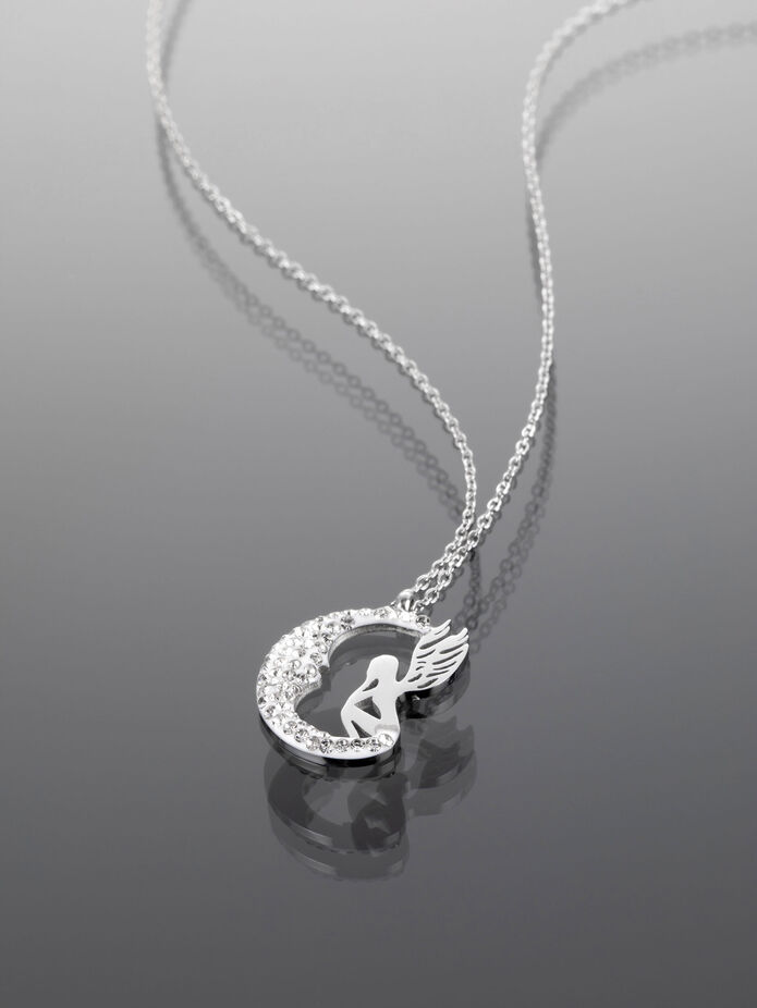 Luxusní náhrdelník z chirurgické oceli s motivem anděla na měsíci s čirými krystaly je skvělým doplňkem k jakémukoliv outfitu.