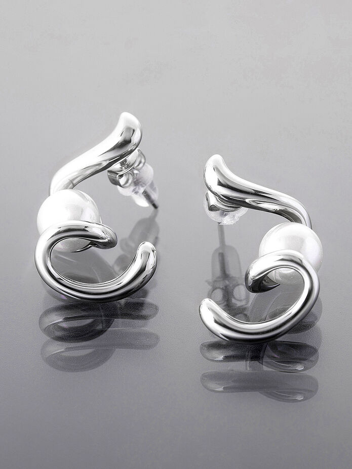 Trendy náušnice ve tvaru spirály s perličkou. Vyrobeno z leštěné chirurgické oceli. Doplňte svoji sbírku šperků tímto krásným, nadčasovým kouskem!
