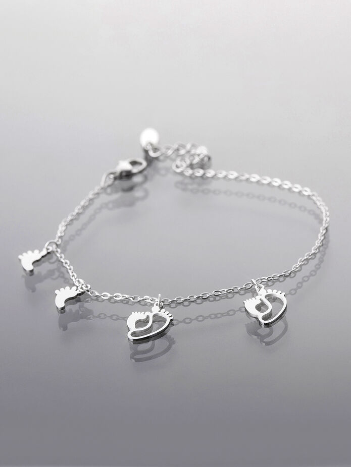 Jemný řetízkový náramek z chirurgické oceli ozdobený otisky chodidel.