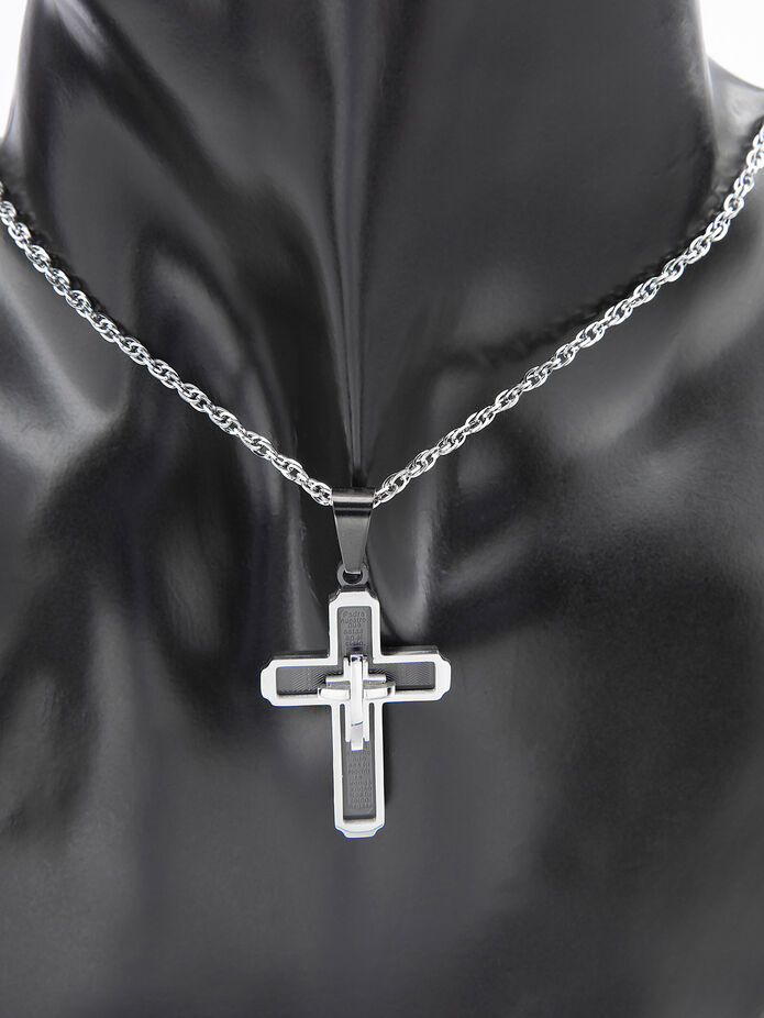 Výrazný přívěsek z chirurgické oceli s detailně zpracovaným křížem na jeho povrchu.