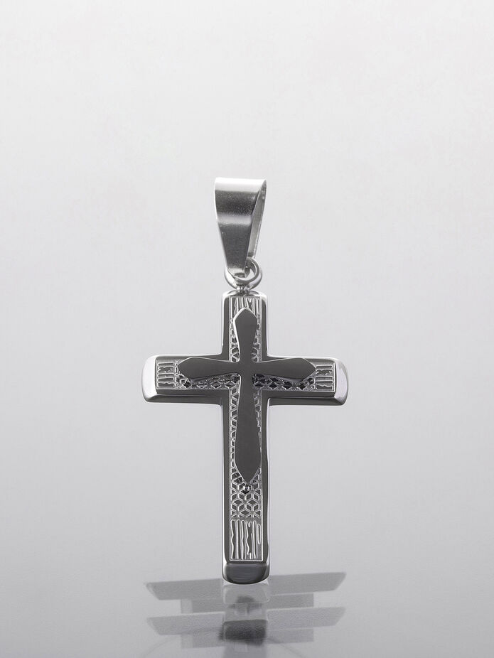 Výrazný přívěsek z chirurgické oceli s detailně zpracovaným křížem na jeho povrchu.
