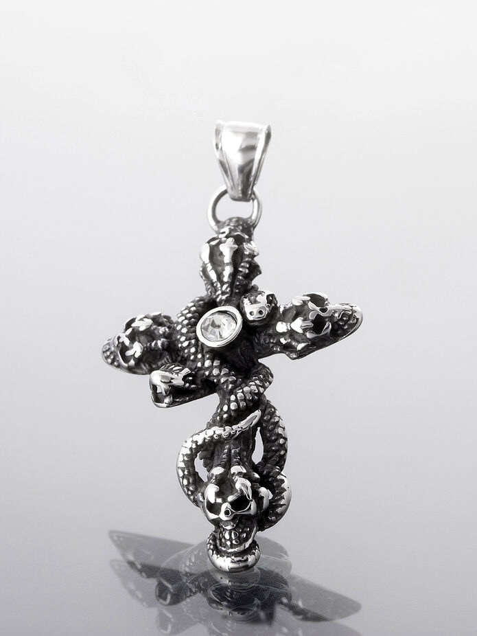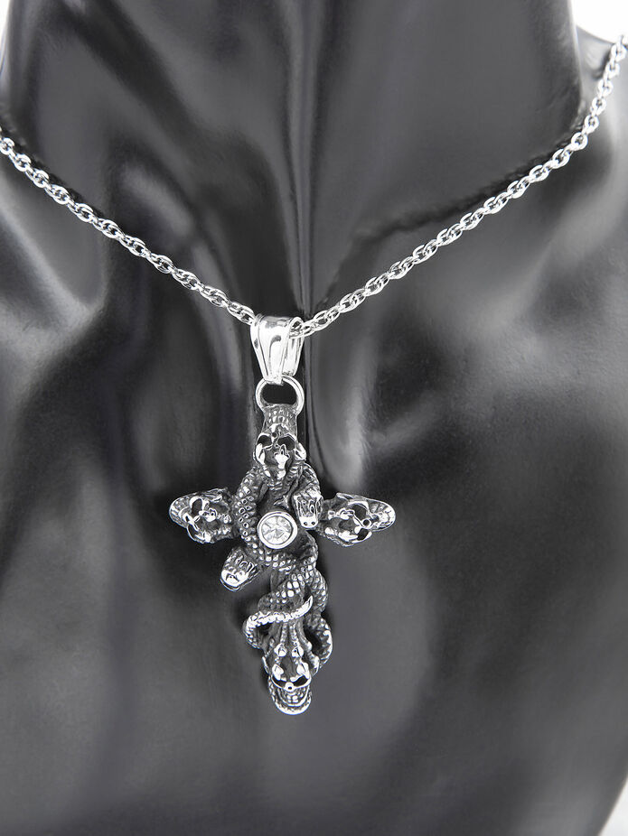 Tento nápadný přívěsek v podobě kříže, který je obtočen hadem, je vyroben z kvalitní chirurgické oceli, která je odolná, hypoalergenní a nemění barvu.