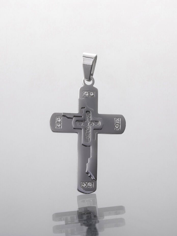 Výrazný přívěsek z chirurgické oceli s detailně zpracovaným křížem na jeho povrchu.