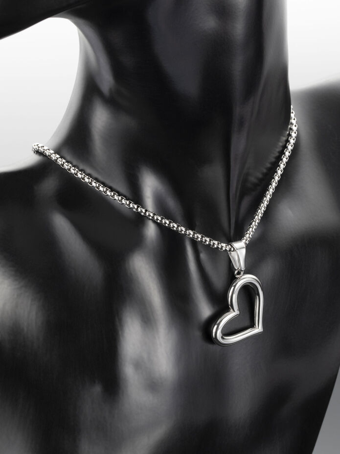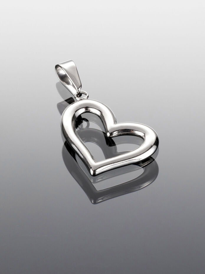 Výrazný přívěsek ve tvaru moderního srdce z chirurgické oceli je skvělým doplňkem k jakémukoliv outfitu.